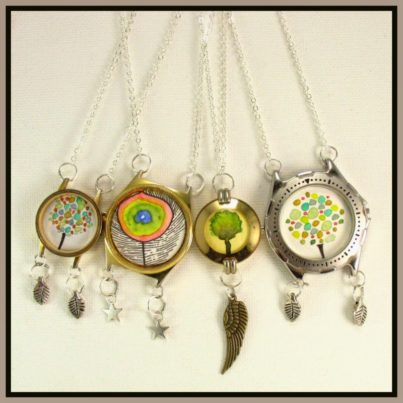 Mini watercolor originals set inside recycled watch cases. $45
